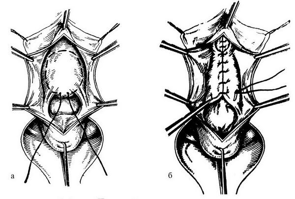 3. Манчестерская операция – рекомендуется при опущении и неполном выпадении матки, особенно при удлинении ее шейки и наличии цистоцеле. Операция направлена на укрепление фиксирующего аппарата матки – кардинальных связок за счет сшивания их между собой, транспозиции.
