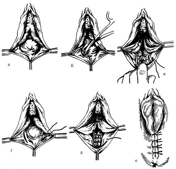 Рис. 18.12. Этапы кольпоперинеолеваторопластики: а – отсепаровка слизистой оболочки задней стенки влагалища; б – отсепаровка и выделение мышцы, поднимающей задний проход; в–д – наложение швов на m. levator ani; е – ушивание кожи промежности