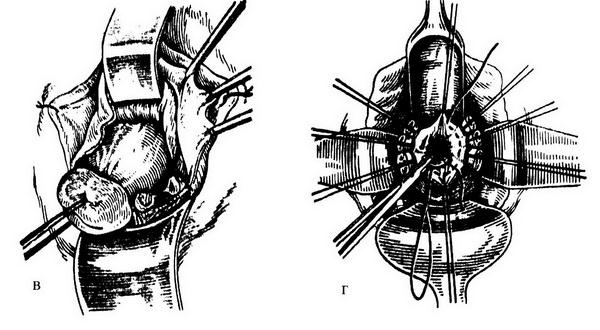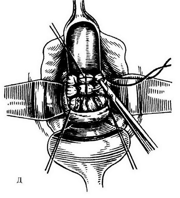 Рис. 18.13. Этапы влагалищной экстирпации матки: а – циркулярный разрез стенки влагалища; б, в – рассечение и лигирование кардинальных связок и сосудистых пучков; г – ушивание брюшины таза кисетным швом; д – сшивание культей кардинальных связок и культей придатков матки между собой
