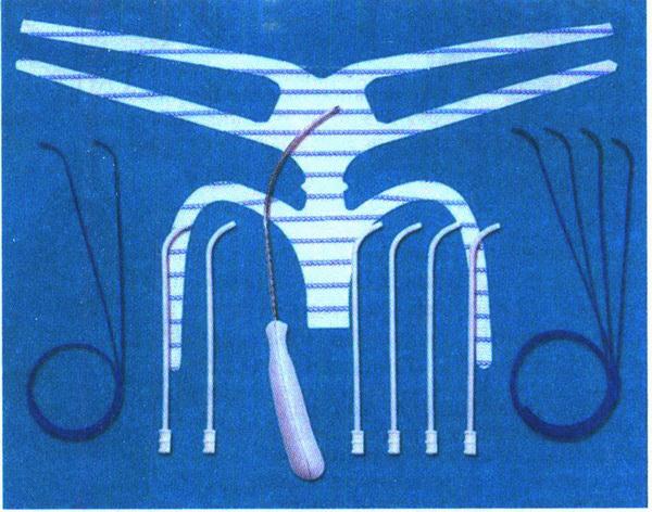 8. Вагинальная экстраперитонеальная кольпопексия (операция TVM – transvaginal mesh) – система полного восстановления поврежденной тазовой фасции с помощью синтетического протеза. Предложено множество различных сетчатых протезов, наиболее универсальна и удобна в применении система восстановления тазового дна Gynecare prolift (рис. 18.14). Данная система полностью устраняет все анатомические дефекты тазового дна по стандартизированной методике. В зависимости от локализации дефекта процедура может быть выполнена в виде реконструкции переднего или заднего отделов или полного восстановления тазового дна.
