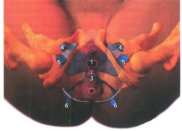 Рис. 18.15. Схема установки протеза: 1 – передняя часть протеза, установленная под мочевым пузырем; 2 – купол влагалища; 3 – задняя часть протеза, установленная над стенкой прямой кишки; 4, 5 – лоскуты протеза, выведенные через обтураторное отверстие в области паховых складок; 6 – в области ягодиц