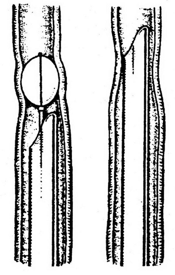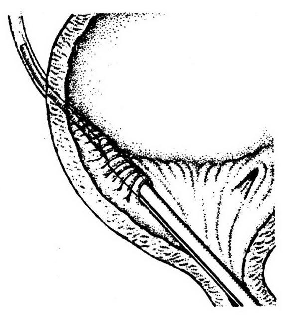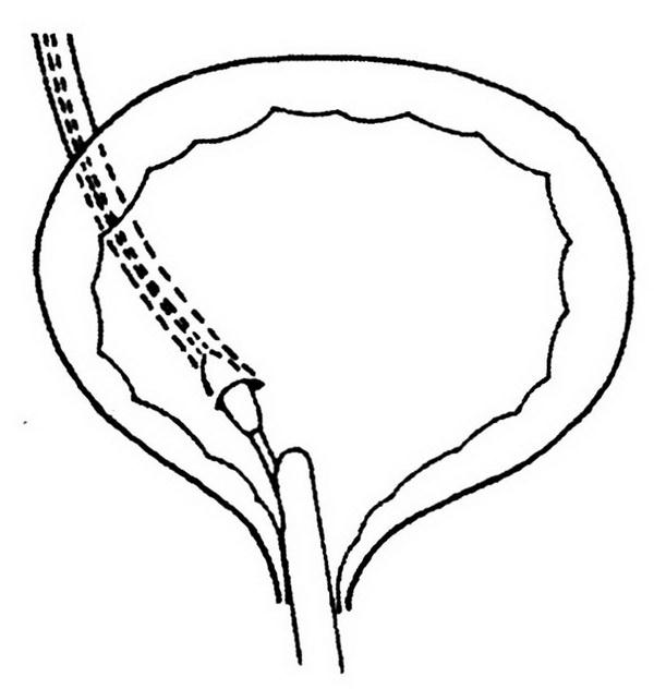 Рис. 2.4. Расширение устья мочеточника и просвета интрамурального отдела мочеточника металлическим бужом с оливой на конце