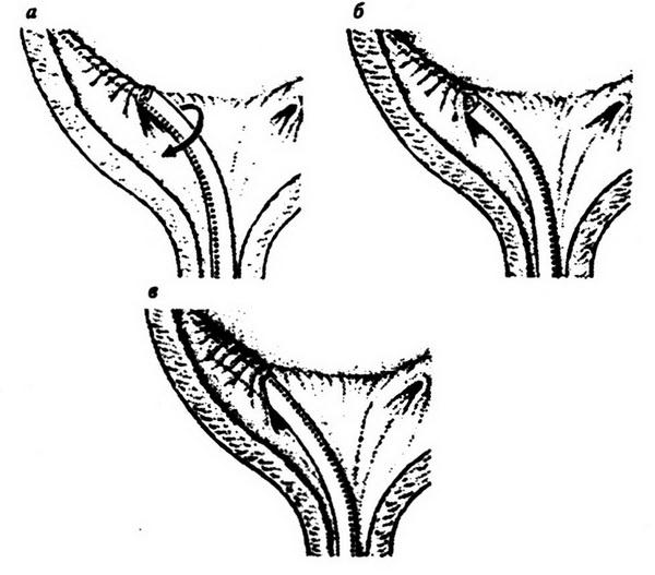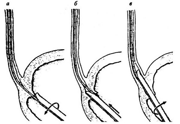 а – поворот уретероскопа вокруг его продольной оси на 180° у входа в устье мочеточника; б – введение уретероскопа в устье мочеточника; в – обратный поворот уретероскопа вокруг продольной оси после проведения его через интрамуральный отдел мочеточника