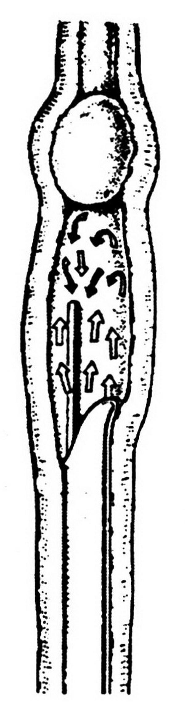 В этом положении проводник приподнимает стенку мочеточника, находящуюся под слизистой, и тем самым устье начинает зиять, уретероскоп проводится в интрамуральный отдел мочеточника.