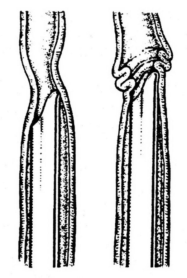 Мочеточник в поясничном отделе может иметь штыкообразный перегиб. Перегиб мочеточника бывает следствием значительной подвижности почки или ранее перенесенной операции. Продвижение уретероскопа по просвету мочеточника в этом случае еще больше увеличивает степень перегиба (рис. 2.10). В этом случае просвет мочеточника и проводник в поле зрения уретероскопа не видны.