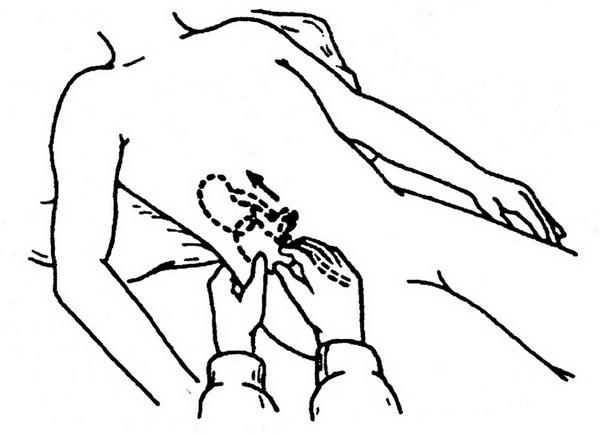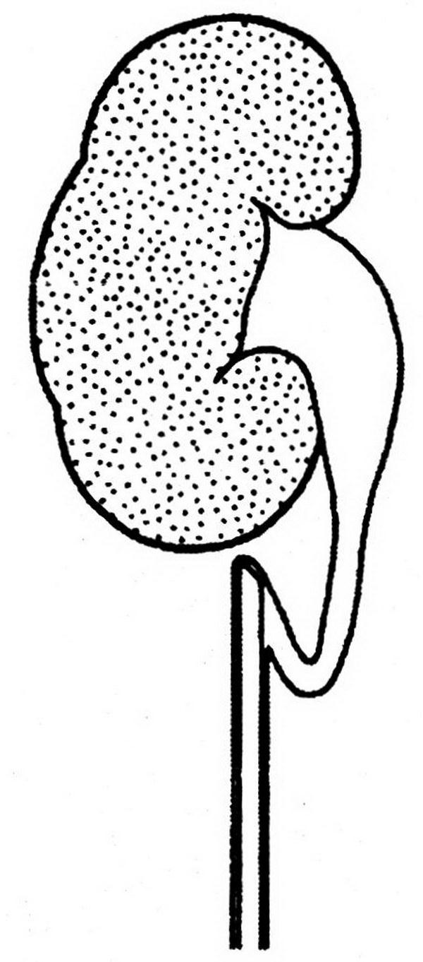 Рис. 2.11. Мануальный прием, позволяющий выпрямить ход мочеточника в его верхней и средней трети – смещение почки вверх приводит к выпрямлению мочеточника