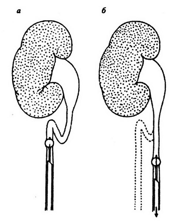 а – баллончик катетера помещен ниже места перегиба; 6 – тракция катетера вниз приводит к выпрямлению хода мочеточника