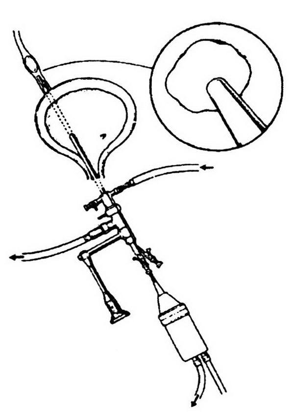 Рис. 2.16. Схема притока и оттока промывной жидкости в процессе ультразвуковой контактной уретеролитотрипсии