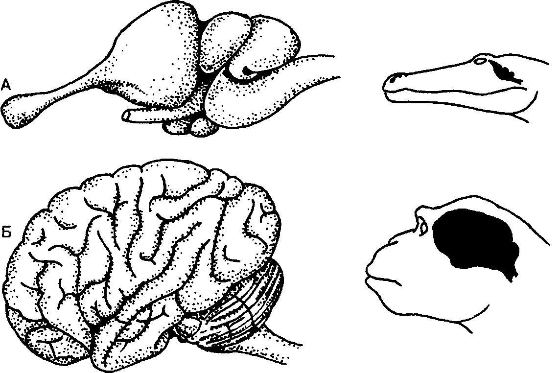 Мозг рептилии (А) и мозг обезьяны (Б)