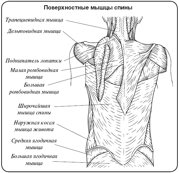 Так условно называются мышцы, приводящие в движение спину или позвоночный столб. Мышцы спины делятся на две группы – поверхностные и глубокие. Поверхностные (внешние) мышцы связаны с поясами конечностей (плечи и бедра) и могут сгибать или поворачивать спину в качестве побочного эффекта изменения положения конечностей (см. рис. на с. 20).