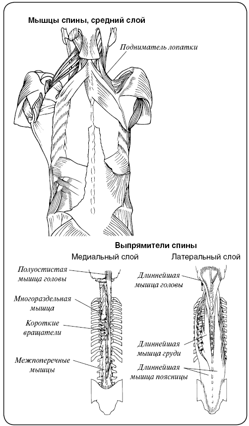 Мышцы, выпрямляющие туловище (крестцово-позвоночные мышцы), лежат по обе стороны позвоночного столба. Медиальные мышцы идут по позвоночному столбу с каждой стороны. Они формируются накладывающимися друг на друга группами мыщц, «переплетенными» друг с другом, и охватывают от 5 до 15 или больше позвонков (см. рис. на с. 21).