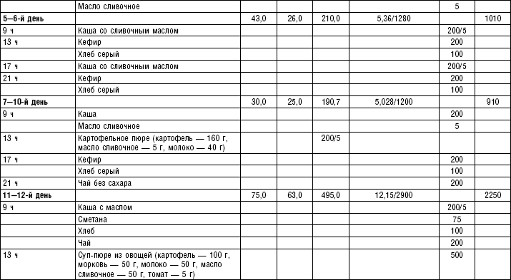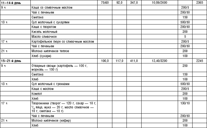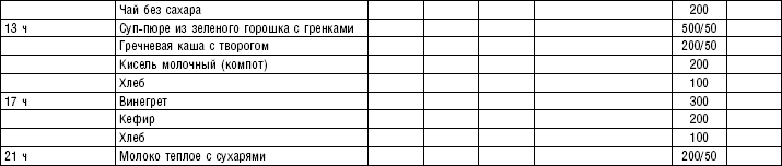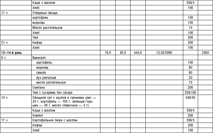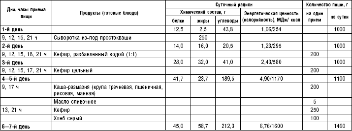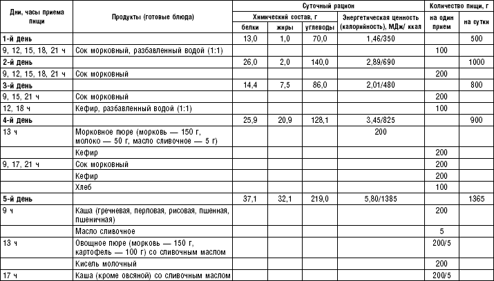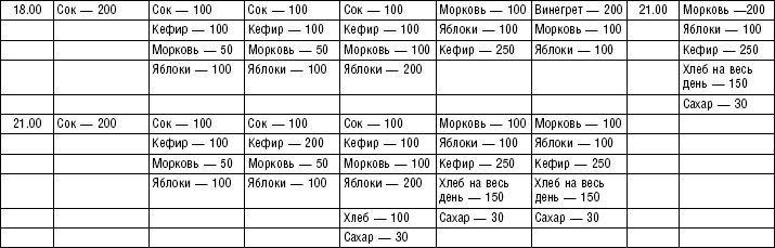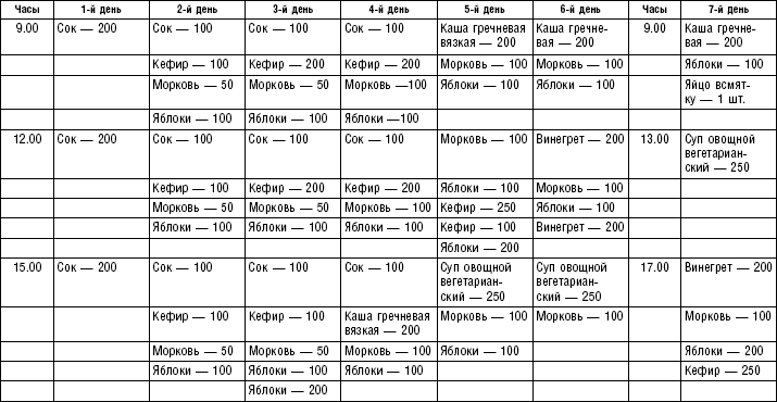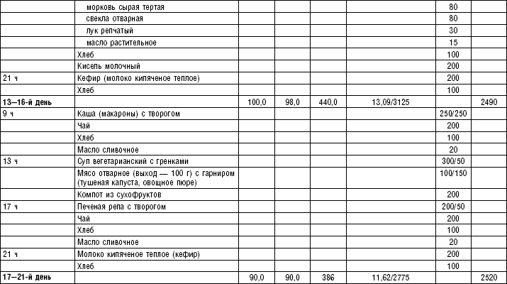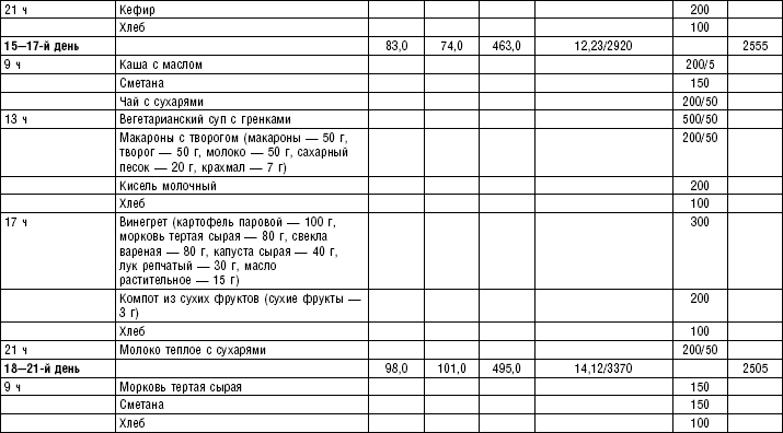 2. Проводить один раз в месяц 3-суточное голодание. Перед его началом целесообразно принять слабительное и освободить кишку. Очистительные клизмы, как правило, не назначаются. Восстановительное питание осуществляется в первый день по рационам 3–4-го дней, во второй день — по рационам 7–10-го дней, в третий день — по рационам 14–15-го дней, предлагаемым в Приложении 3. Эти разгрузочные периоды могут проводиться в амбулаторных или домашних условиях под наблюдением врача.