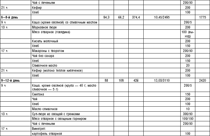 Режим питания и распределение суточного количества пищи по дням на первую неделю восстановительного периода, г (мл)
