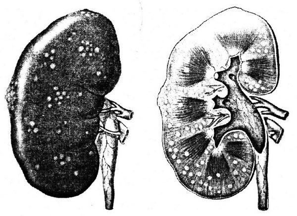 Образование мелких гнойничков в почке представляется следующим образом. Микроорганизмы оседают преимущественно в капиллярных петлях клубочков, перитубулярных капиллярах и концевых сосудах почки. Образовавшиеся в результате этого бактериальные тромбы становятся источником милиарных гнойничков. Они располагаются поверхностно в коре почки и в большом количестве под фиброзной капсулой, благодаря чему хорошо видны при осмотре почки. Гнойнички желтоватого цвета диаметром 1–2 мм, расположены одиночно или группами. Почка при апостематозном пиелонефрите увеличена в размерах, вишневого цвета. Фиброзная капсула утолщена, околопочечная клетчатка отечна. После снятия капсулы поверхность почки кровоточит, видны множественные мелкие абсцессы. На разрезе почки мелкие гнойнички обнаруживаются не только в корковом, но и в мозговом слое.