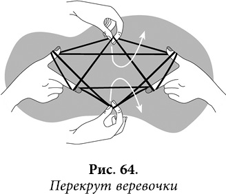 Узел «перекрута» в системе выступает противовесом левитации. Он не дает развалиться системе левитации, выступая провокатором, не позволяющим системе спать и лениться. Ведь система левитации – это проход в светлый мир, откуда система получает энергию. Эту энергию она должна «переварить» через себя и выдать на гора новую. Точно так же, как и электроны: отражаясь от стекла, из него вылетают не те же самые, как думали ученые на заре квантовой физики, а другие, после перегруппировки. «Перекрут» таким образом осуществляет необходимое переформатирование за счет противоположной энергии. На рис. 64 видно, что новое переформатирование фигуры веревочек выходит из глубины этого центра.