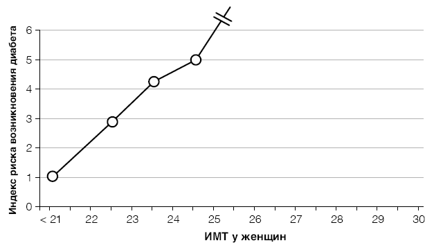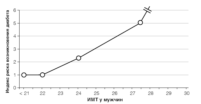 Приведу пример: риск диабета (в качестве параметра возьмем индекс массы тела) оказывается в шесть раз выше у женщин с ИМТ 25, чем у женщин с ИМТ 21. Такая разница между женщиной ростом 1,67 м весом 70 кг и женщиной того же роста весом 59 кг. Похожее наблюдается у мужчин с ИМТ 27,5 и ИМТ 22, то есть мужчина ростом 1,78 м весом 69 кг имеет в пять раз более низкий риск заболеть диабетом, чем мужчина весом 87 кг (Рис. 19) [2].