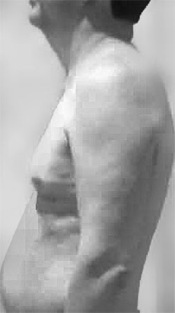 В боковой плоскости эту проблему видно еще более явственно – по сутулости, опущенным плечам, закрытой грудной клетке, отекшему животу. Передний «костюмчик» в этом случае сползает вниз, а задний тянется вверх, приводя к росту холки. Передняя поверхность шеи при этом находится гораздо ниже, чем положено – она тянется своими фасциями в средостение или кишечник (рис. 80).