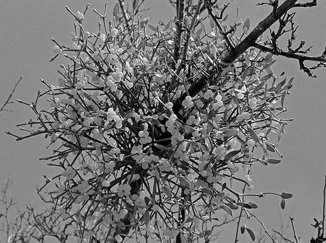 Viscum album L. – научное название рода происходит от латинского слова viscosus – «вязкий», «липкий». Белая омела – «птичий клей», «ведьмина метла» – вечнозеленый кустарник из семейства ремнецветных шарообразной формы, паразитирующий на других деревьях. Самая лечебная омела – с березы и плодовых деревьев, а взятая с тополя может быть очень вредной. В качестве лекарственного сырья используют молодые побеги с листьями. Но есть и другие виды: на дубе может расти и омела европейская, с опадающими на зиму листьями и желтоватыми плодами. Такую омелу употреблять нельзя!