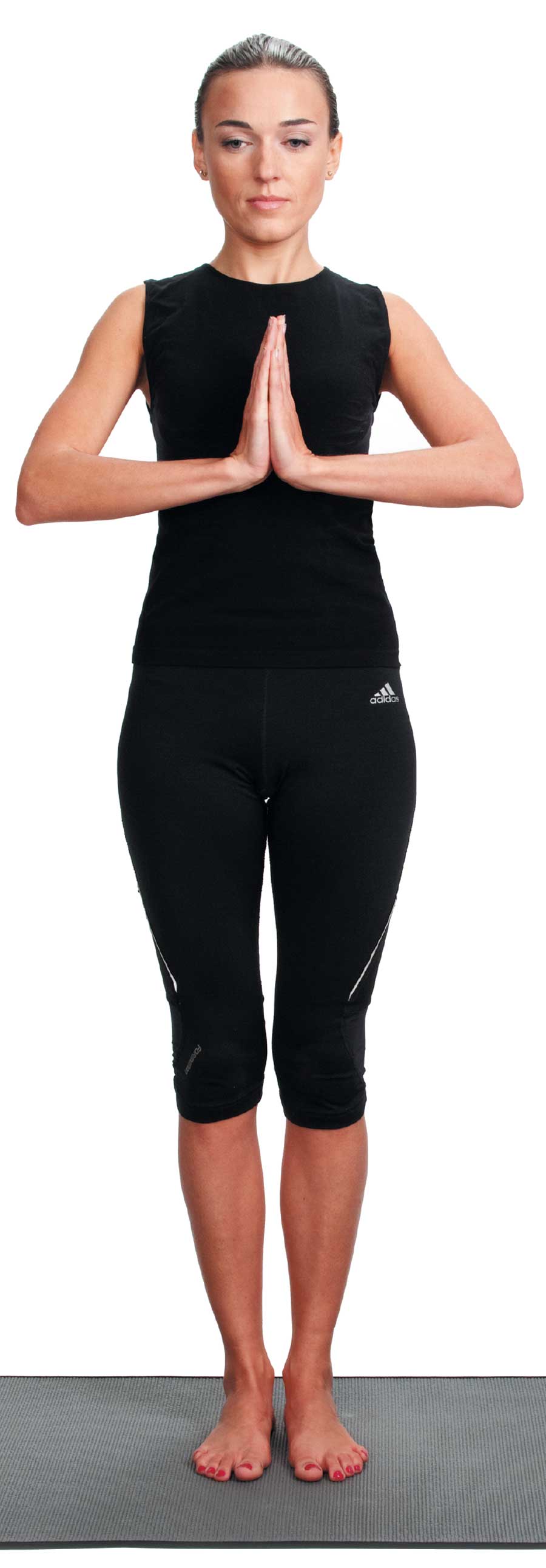 В отличие от тадасаны слегка опустите голову, руки сложите в позу молитвы. Одновременно немного разведите стопы, расположив их параллельно друг другу на ширине бедер. В результате вы достигнете более устойчивого положения, чем в позе горы.