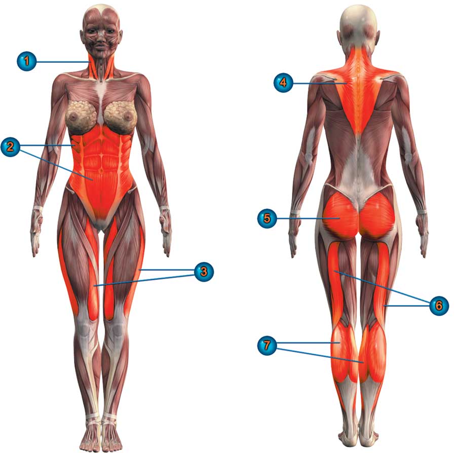 1 – грудино-ключично-сосцевидная мышца, 2 – мышцы брюшного пресса, 3 – широкие мышцы бедра, 4 – трапециевидная мышца, 5 – большая ягодичная мышца, 6 – двуглавая мышца бедра, 7 – латеральная и задняя группы мышц голени