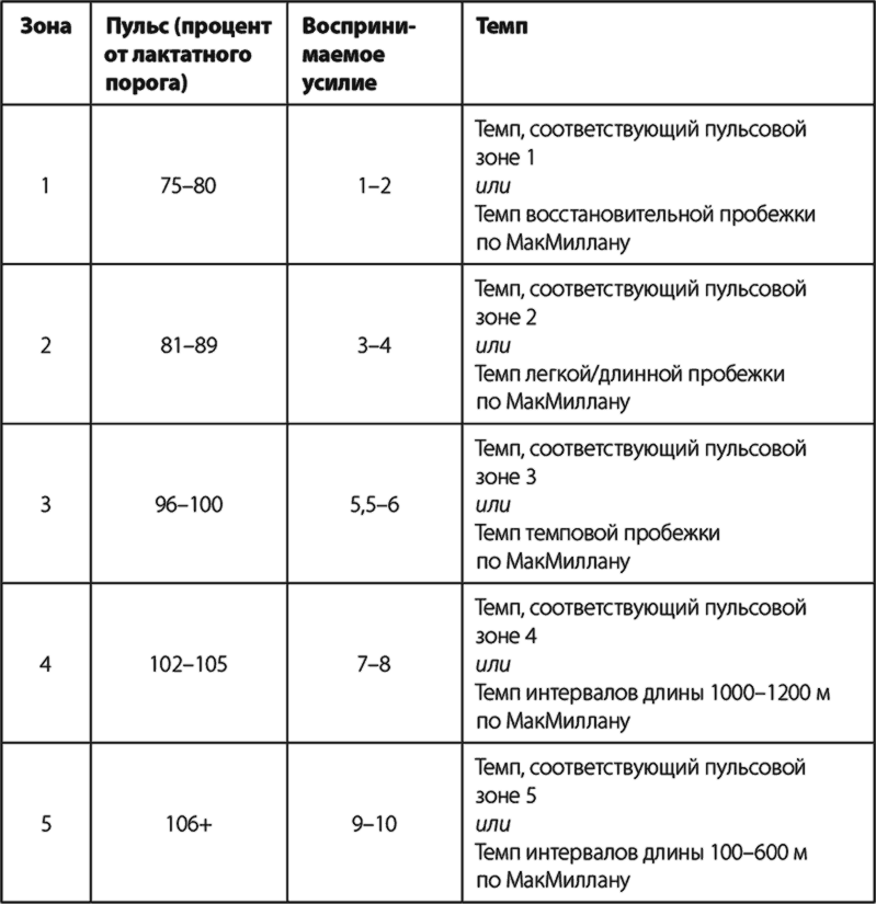 Не так сложно привести эти результаты в соответствие с воспринимаемым усилием и пульсовыми зонами, описанными ранее в этой главе. Таблица 6.5 показывает, как рекомендации МакМиллана по темпу пробежек и рекомендации по темпу, основанные на пульсе, соотносятся с пульсом и воспринимаемым усилием в моей пятизонной схеме.