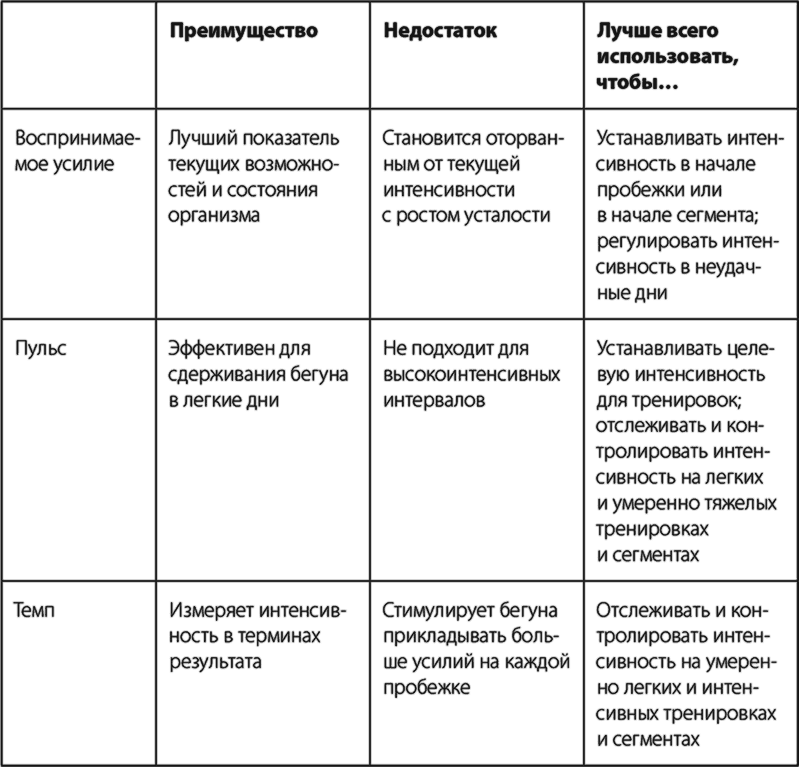 Темп, то есть время на прохождение определенной дистанции, отражает интенсивность иначе, чем воспринимаемое усилие и пульс. Интенсивность тренировки – это входящий параметр: это то, как много физиологических усилий организм вкладывает в бег. Воспринимаемое усилие и пульс – прямые индикаторы этого усилия. Темп, с другой стороны, измеряет выход (результат) этого усилия. Это делает темп надежным индикатором интенсивности, поскольку существует прямая связь между тем, сколько усилий вкладывается в бег, и результатом на выходе. Если вы бежите быстро, это может быть только потому, что ваше тело работает интенсивнее.