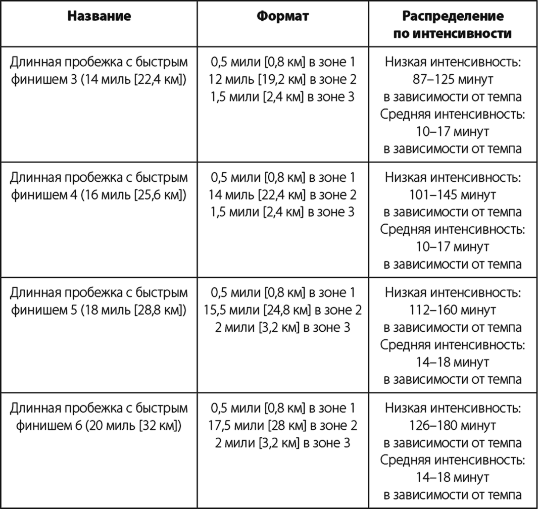 Длинные пробежки с быстрым финишем – тренировки с низкой интенсивностью и короткой работой со средней интенсивностью в конце. Как и длинные тренировки с игрой со скоростью, они улучшают способность сопротивляться нарастающему утомлению в конце тренировочного цикла после развития базовой выносливости, необходимую для финиша в ваших следующих соревнованиях. Эти тренировки также измеряются по расстоянию.