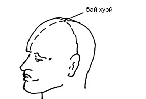 3. На вдохе живот втягивается. Слегка подталкиваем его руками внутрь. Шарик устремляется в живот. Поджимаем ягодицы и сжимаем анус. Шарик устремляется к промежности. Втягиваем живот, продолжаем сжимать анус – шарик движется вверх к груди. Ста раемся «проследить» его движение как можно выше, к макушке (точка Бай-хуэй, рис. 53).