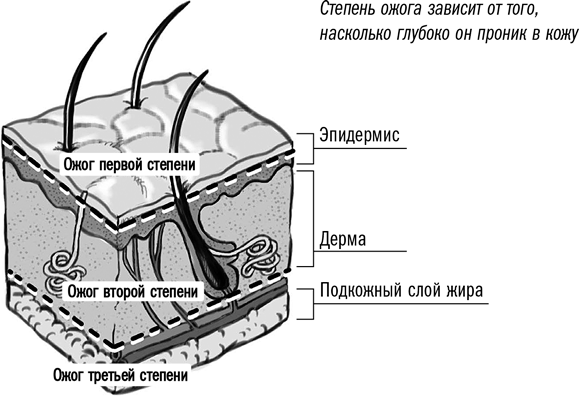 Попробуйте холодный компресс или гель алоэ вера, а также противовоспалительное средство – например, ибупрофен («Адвил») или напроксен («Алив»), обладающие обезболивающим действием. (Никогда не давайте аспирин (ацетилсалициловую кислоту) детям! Он может спровоцировать опасную болезнь – синдром Рея.) Поскольку ожоги первой степени затрагивают лишь верхний слой кожи, они заживают за несколько дней. Обычно мертвая кожа в итоге отслаивается, когда ее место занимает новый слой кожи.