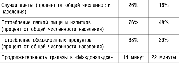 Дополнительная информация о французах показывает, что в США, по сравнению с Францией, вдвое больше случаев ожирения и среди взрослых, и среди детей. У французов больше ожидаемая продолжительность жизни, они принимают меньше лекарств и заметно реже страдают сердечными заболеваниями (см. таблицу «Сравнительные показатели во Франции и США»). Однако французский рацион, на первый взгляд, кажется куда менее здоровым. Это широко известно как французский парадокс. Примечательно, что во Франции самое высокое среди развитых стран потребление молочных жиров (сливки, масло и сыр) на душу населения (Жине, 2008).