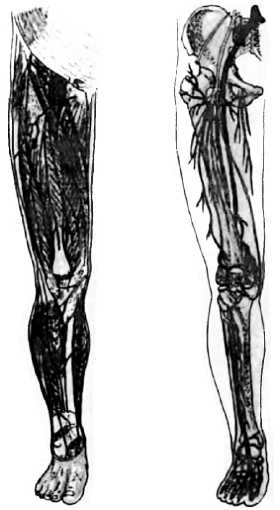 Под кожей на задней стороне ноги находятся мышцы, нервы, которые идут от тазобедренной области к стопам, и вены, проходящие по задней и внутренней стороне голени. Под слоем мышц находится главный нерв, выходящий из области тазобедренного сустава вниз, а несколько меньших нервов, ответвляясь от главного нерва, поднимаются к области таза (рис. 5-110).