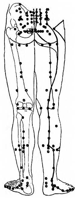 Рис. 5-114. Главные каналы ци и акупунктурные точки на ноге (вид сзади)