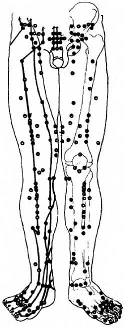 Рис. 5-115. Главные каналы ци и акупунктурные точки на ноге (вид спереди)