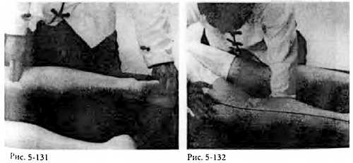 Закончив массировать ягодичные мышцы, поднимите голень пациента, чтобы расслабить мышцы бедра и голени. Основанием ладони прижимайте и отпускайте заднюю сторону бедра, направляясь вниз к колену (рис. 5-136).