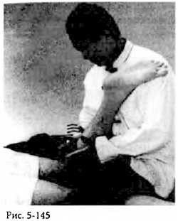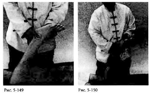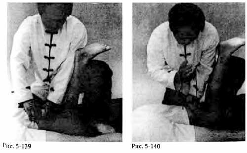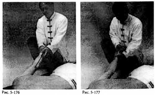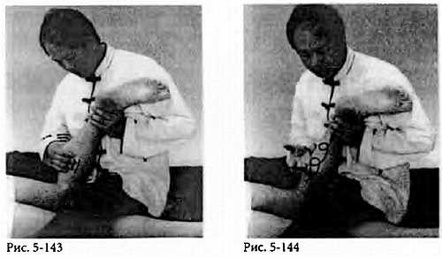 Будьте осторожны, поскольку на внутренней стороне голени находится связка, которую можно легко травмировать. Захватывайте задние и боковые мышцы голени и растирайте их, направляясь от колена к лодыжке (рис. 5-43). Этот массаж можно также делать ребром ладони (рис. 5-144).