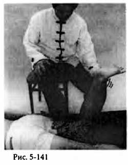Ребром ладони мягко ударяйте по задней и боковой сторонам бедра, начиная от таза и направляясь к колену (рис. 5-140). В результате накопившаяся ци и кровь направятся к поверхности. Повторите процедуру несколько раз.