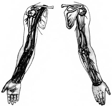 На задней стороне руки под кожей находятся мышцы, нервы, идущие от плеча к кисти, и вены, проходящие по задней и внутренней стороне руки (рис. 5-152).