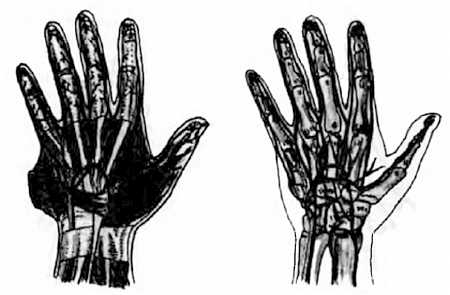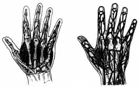 На рисунках 5-154 и 5-155 показано анатомическое строение кистей. Видно, что большинство сосудов и нервов находится между костями.