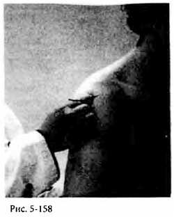 В результате массажа точек Цзяньляо и Цзяньюй ци направляется к верхним конечностям. Массируйте эти точки большим, указательным или средним пальцем. Круговые движения пальцев правой руки на правом плече делайте против часовой стрелки (рис. 5-158). Естественно, на левом плече круговые движения левой руки направлены по часовой стрелке.