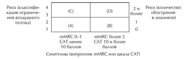 Последняя редакция GOLD (2011) предлагает разделять пациентов с ХОБЛ на группы на основе интегральной оценки симптомов, спирометрической классификации и риска развития осложнений (рис. 2).