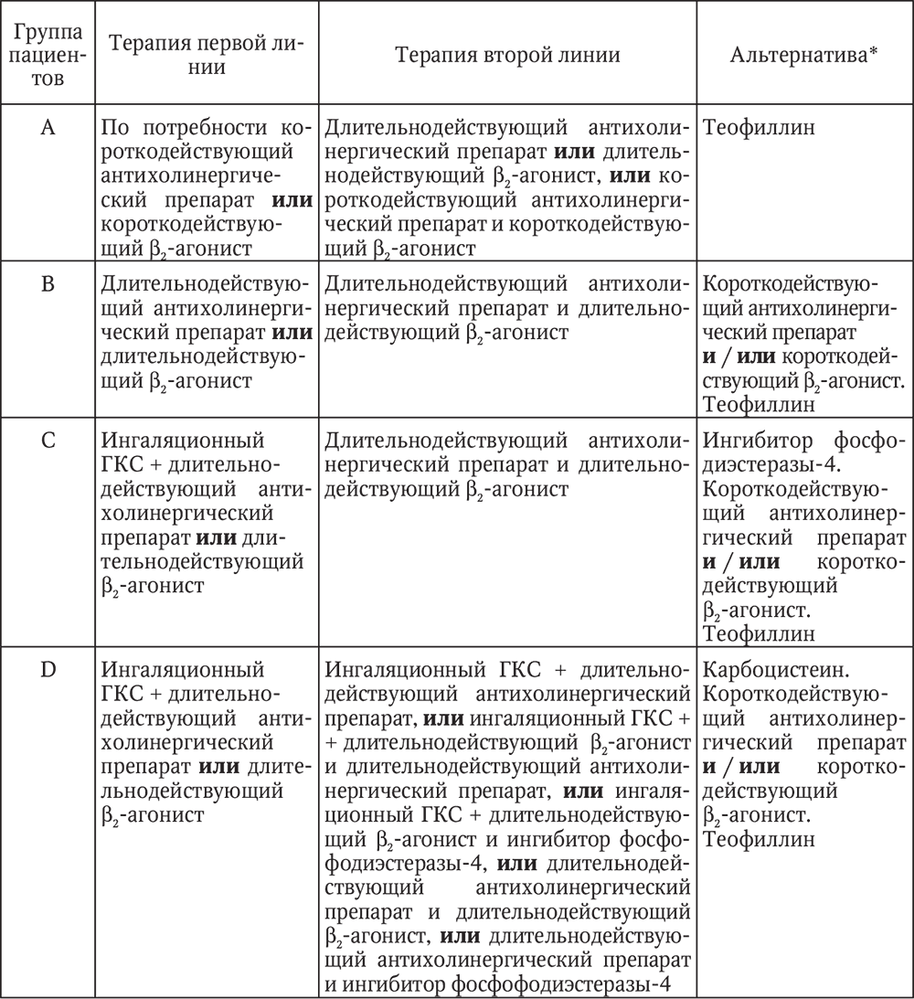 Последняя редакция GOLD (2011), в соответствии с выделенными группами пациентов А, В, С и D, дает следующие рекомендации по начальной тактике лекарственной терапии при ХОБЛ, которые представлены ниже в табл. 10. По сравнению с предыдущей таблицей следует отметить расширение возможных сочетаний ранее использовавшихся препаратов и добавление препарата новой группы – ингибитора фосфодиэстеразы-4.