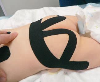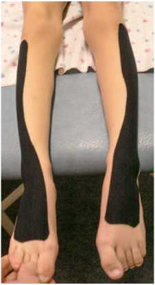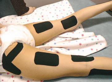В данном примере тейпирование с использованием тейпов серии FP было проведено пациентке, которая уже на протяжении двух месяцев получала курс тейпинга без перерывов, с постоянной небольшой динамикой в виде улучшения выполнения других методик реабилитационного лечения. В приведенном случае выполнен вариант классического тейпинга, проводившийся ранее, но с добавлением тейпирования с использованием FP-серии (рис. 24, в) на мышцах-сгибателях голени и бедра.