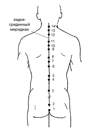 Продвигаемся по исцеляющим точкам снизу – вверх. Меридиан Ду-май центростремительный, энергия движется вверх. Стандартных точек (возбуждающих, успокаивающих, противоболевых) меридиан не имеет.