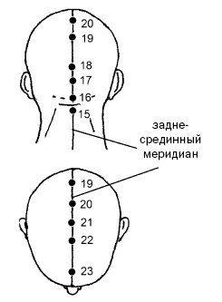 19. Хоу-дин (в переводе означает «позади темени») расположена на средней линии головы выше задней границы роста волос на 5,5 цуней (на 1,5 цуня выше точки 18). Показания к использованию: головная боль в теменной или височной области, ригидность мышц затылка, головокружение; депрессия, сильное возбуждение.