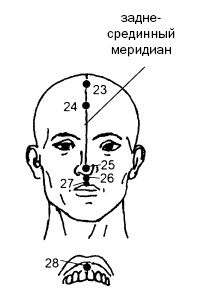 23. Шан-син («верхняя звезда») расположена на средней линии головы выше передней границы роста волос на 1 цунь. Показания к использованию: головная боль, невралгия тройничного нерва; боль в глазах, снижение остроты зрения; нарушение носового дыхания; сильное перевозбуждение вплоть до судорог.