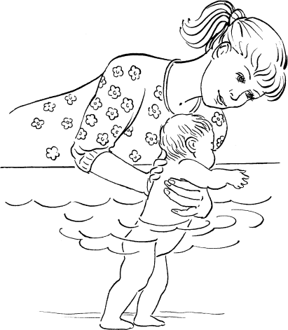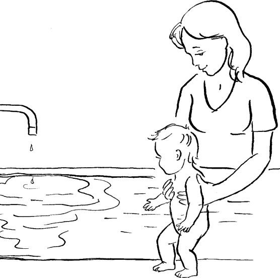 Выведите кран над ванной на середину, включите холодную воду. В это время малыш должен находиться в другом конце ванны или мама может просто приподнять его, чтобы держать его (в первое время). Таким образом образуется вокруг струи холодное пятно воды (рис. 441).