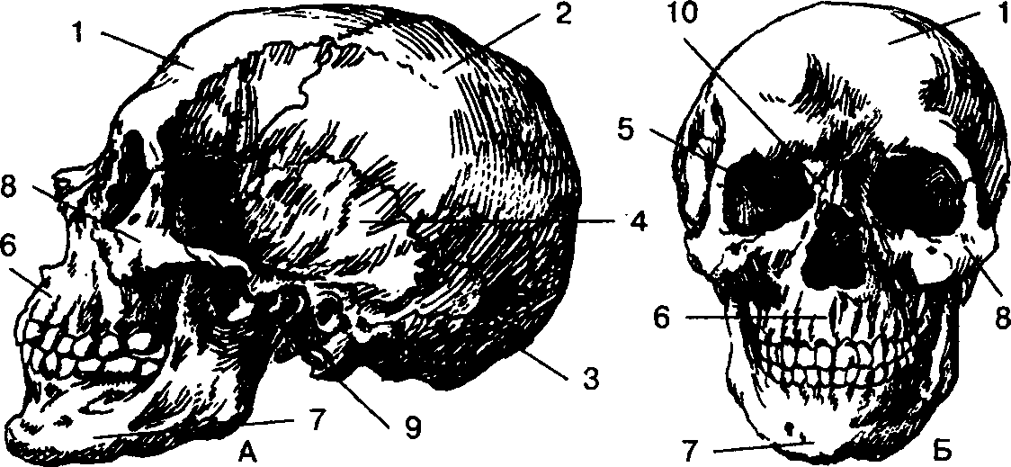 Череп человека: А – сбоку; Б – спереди; 1 – лобная кость; 2 – теменная кость; 3 – затылочная кость; 4 – височная кость; 5 – глазница; 6 – верхняя челюсть; 7 – нижняя челюсть; 8 – скуловая кость; 9 – скуловой отросток височной кости;10 – носовая кость