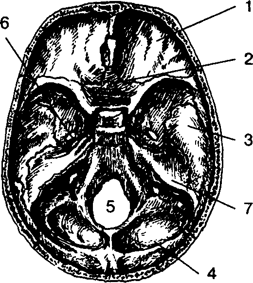 Череп человека (разрез, вид сверху): 1 – глазничные отростки лобной кости; 2 – клиновидная кость; 3 – чешуя височной кости; 4 – затылочная кость; 5 – большое затылочное отверстие; 6 – отверстия, через которые выходят нервы; 7 – пирамида височной кости