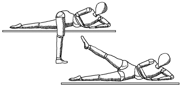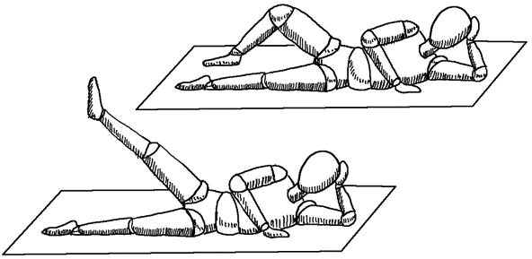 7. ИП: лечь на левый бок. Левая нога выпрямлена. На руки приходится дополнительный упор. Правую прямую ногу вынести вперед под прямым углом. Поднять правую ногу вверх, вытянув пальцы. Выполнив упражнение правой ногой, повторить его левой (рис. 6.23).