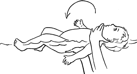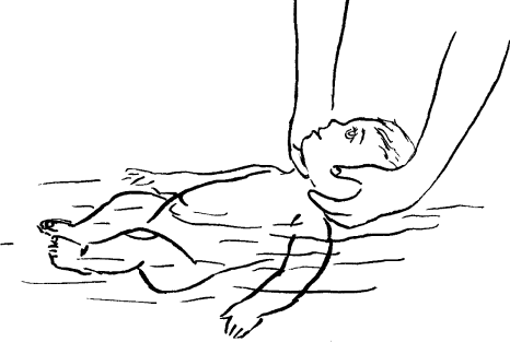 Исходное положение. Опустите ребенка в воду так же, как в предыдущем упражнении, – спиной на правую руку. Указательным и средним пальцами левой руки фиксируйте подбородок малыша. Четвертый и пятый пальцы ложатся на его грудь, большой – вдоль уха к височной кости (рис. 438).